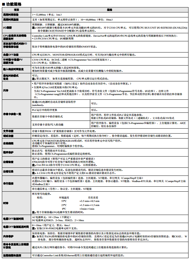 有兩種類型的CPU: 標(biāo)準(zhǔn)型CJ1和超高速型CJ1-H。對(duì)于基本指令,最快速度可達(dá)20ns(0.02us)。